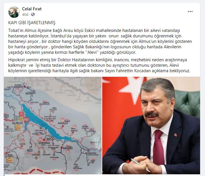 Alevi Dernekleri Federasyonu (ADFE) Genel Başkanı Celal Fırat, sosyal medya hesabında, Sağlık Bakanlığı'na ait bir harita paylaşarak, haritada Tokat'ın Almus ilçesinin Alevi köylerinin işaretlendiğini açıkladı.