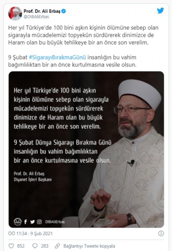 Diyanet İşleri Başkanı Ali Erbaş, Sigarayı Bırakma Günü dolayısıyla sosyal medyada bir mesaj paylaştı. Erbaş mesajında, "Her yıl Türkiye'de 100 bini aşkın kişinin ölümüne sebep olan sigarayla mücadelemizi topyekun sürdürerek dinimizce de haram olan bu büyük tehlikeye bir an önce son verelim" ifadelerini kullandı.