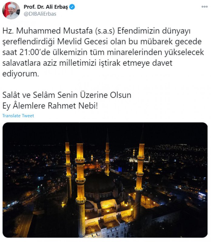 "Hz. Muhammed Mustafa Efendimizin dünyayı şereflendirdiği Mevlid Gecesi olan bu mübarek gecede saat 21.00'de ülkemizin tüm minarelerinden yükselecek salavatlara aziz milletimizi iştirak etmeye davet ediyorum."