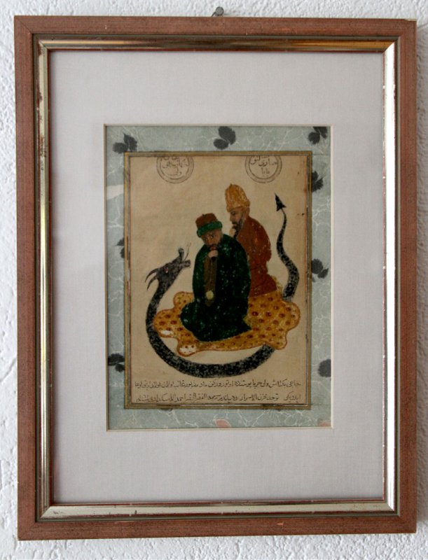 Resim, 22x17 santimetre boyutlarında ve bir post üstünde oturan iki kişiyi tasvir ediyor. Resmin sağ üst köşesinde Osmanlıca, "Sarı Saltuk Baba", sol tarafında ise "Hünkar Hacı Bektaş Veli" yazıları bulunuyor.