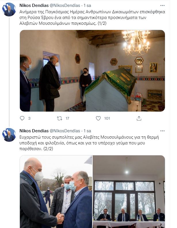 Yunanistan Dışişleri Bakanı Nikos Dendias, Dünya İnsan Hakları Günü'nde Batı Trakya'da bulunan Alevilerin en önemli dergahlarından birisi olarak kabul edilen Seyit Ali Sultan Dergahı'na bir ziyaret gerçekleştirdi.