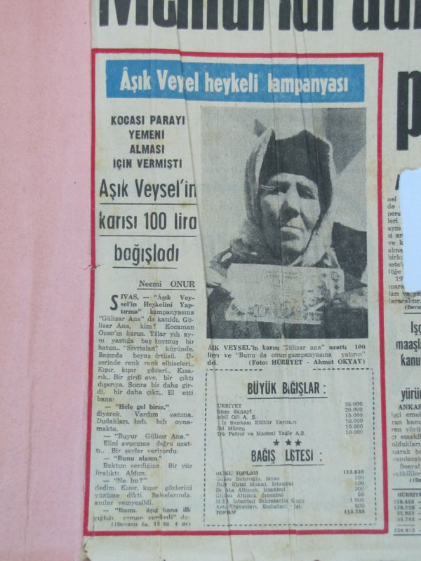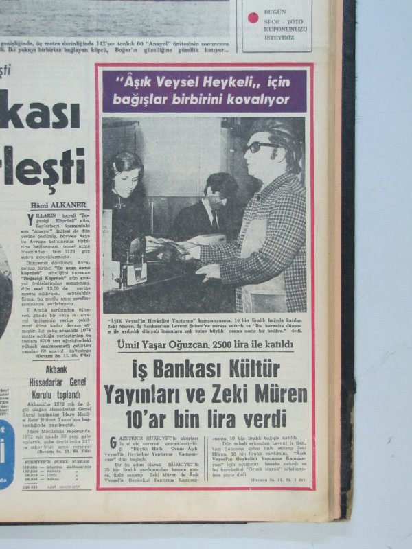 Hürriyet Gazetesi’nin 27 Mart 1973 tarihli nüshasının bir yanında İstanbul Boğaz Köprüsü’nün tamamlandığı haberi, diğer yanında “Âşık Veysel Heykeli İçin Bağışlar Birbirini Kovalıyor” üst başlığı altında Zeki Müren’in İş Bankası Levent Şubesi veznesi önünde elinde bir tomar parayla fotoğrafı yer alıyordu. Fotoğrafın altında şöyle yazıyordu: