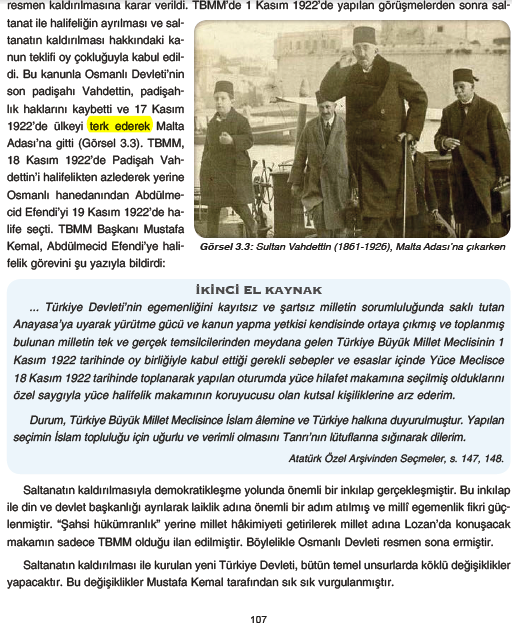 “TBMM’de 1 Kasım 1922’de yapılan görüşmelerden sonra saltanat ile halifeliğin ayrılması ve saltanatın kaldırılması hakkındaki kanun teklifi oy çokluğuyla kabul edildi. Bu kanunla Osmanlı Devleti’nin son padişahı Vahdettin, padişahlık haklarını kaybetti ve 17 Kasım 1922’de ülkeyi terk ederek Malta Adası’na gitti.” (2)