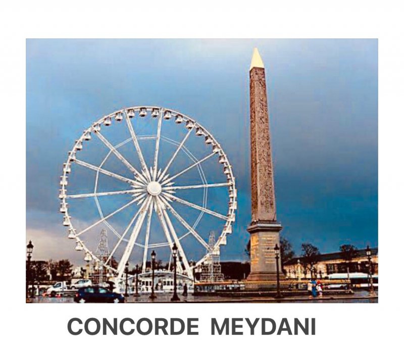 Concorde Meydanı;Fransa’nın ikinci en büyük meydanıdır. İtalyan yazar, gazeteci ve diplomat olan Curzio Malaparte, "Concorde Meydanı ;meydan değil, aydınlıktır" demiştir. 1763 yılında açılışı gerçekleştirilen meydanın ortasında, 23 metre uzunluğunda, 280 ton ağırlığında, İstanbul Sultanahmet Meydanı’ndaki dikilitaşın bir benzeri yer almaktadır. Bu dikilitaş 19. yüzyılda Mısır Hükümeti tarafından Fransa’ya hediye edilmiş ve ardından Mısır Obeliksi olarak da anılmaya başlanmış. Üzerinde, II. Ramses’in hükümdarlığını anlatan çeşitli hiyeroglifler yer almaktadır .Şehrin pek çok yerinden görülebilen La Grande Roue ;Dikilitaşın arkasındadır. La Grande Roue, 1900 senesinde inşa edilmiş olan 100 metre yüksekliğinde bir dönme dolaptır. 1980'lere kadar dünyanın en büyük dönme dolabı unvanını korumuştur.