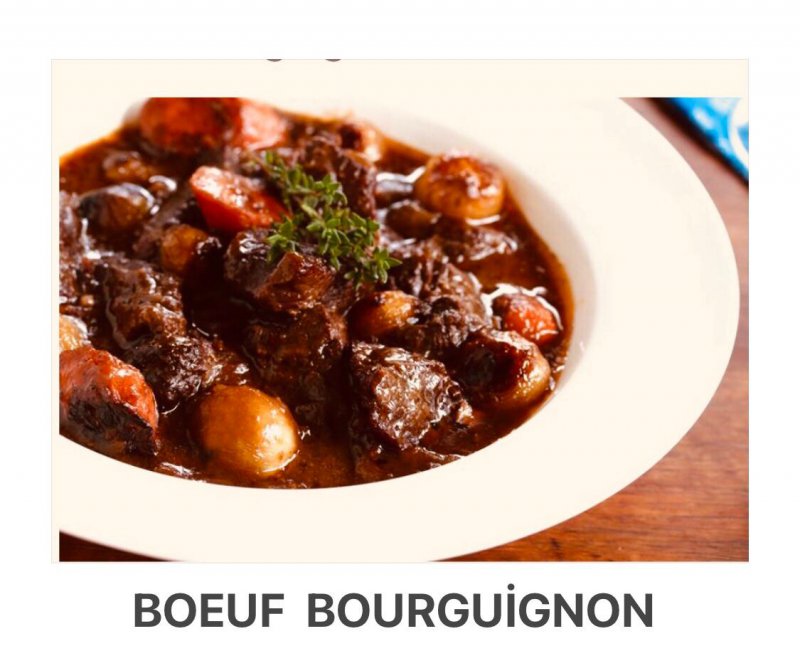 Julia& Julie filmi ile ünlenen Boeuf bourguignon, Fransa’nın çok bilinen ve en çok yapılan geleneksel Fransız yemeklerindendir. Ünlü et yemeklerinden olan Boeuf bourguignon, etin kırmızı şarap ve et suyu ile kısık ateşte pişirilmesi ile yapılıyor. Ayrıca ete sarımsak, soğan, mantar ve diğer taze bitkiler eklenerek lezzetlendiriliyor.