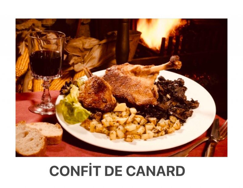 Confit de canard; kendi yağı dışında herhangi bir yağ kullanılmadan hazırlanan ördek bacağına verilen isimdir. Uzun sürede pişirilen yemek; tuz, sarımsak, kekik ve isteğe göre diğer baharatların da eklenmesi ile aroma kazanır ve kıvamını alması için de bir günden fazla bekletilir. Yemek hazırlandıktan ve kıvamını kazandıktan sonra genellikle kızarmış ya da ızgara edilen patates ve soğan ile servis edilir.