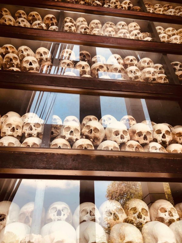 Kamboçya'nın başkent Phnom Penh'e e yaklaşık 15 kilometre uzaklıktaki ölüm tarlaları denilen toplu mezarların bulunduğu meşhur ‘ölüm tarlaları'nda dikilen, insanlık dramını anlatan jenosid anıtı, Pol Pot'un ardında bıraktığı diğer bir 'tarihi miras'. İnsanlık utancı olarak gelecek nesillere 'hediye' edilen Kamboçya'nın kanlı tarihinin ve Kızıl Khmerlerin mirası olan pirinç bataklıklarının hemen yanı başındaki bu yerde, her kuyuda 100 ile 500 arası insan cesedinin bulunduğu 129 toplu mezar var. Girişte Pol Pot tarihi mirası olarak büyük bir insanlık dramını anlatan Cam kafeslerin içinde kurbanlara ait kuru kafalardan oluşan Soykırım Anıtı yer almaktadır.