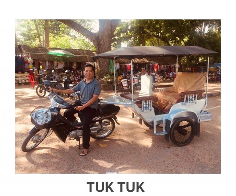 125cclik bir motora römork takıp iki kişilik oturma düzeniyle trafikte seyreden “tuktuk”adını verdikleri motor taksilerin mesafe fiyatları 3 km ye kadar 1 dolar sonrası 2 dolar ama size 5 dolardan fiyat çekerler. Pazarlık yapıp 2 Dolardan fazla vermeyin.Her yerde tuktuk! Süper de pratik! Kişi başı 1 dolar verdiğinizde, kraliyet sarayı, Rus pazarı veya pagodalar, istediğiniz her yere götürüyorlar. Sadece pazarlık faslı zamanla yorucu geliyor. Phnom Penh’li tuktuk sürücüleri de, tüm esnaf gibi pazarlığı çok iyi biliyor. Değeri 1’se 10 diyerek başlıyorlar ama anlıyorsunuz ki zaten bu 2’de bitecek.