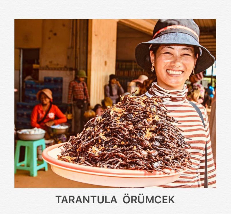 Başkent Phnom Penh’e yaklaşırken bir kasabada diğer böcekler (çekirge,karafatma) gibi kızarmış tarantula da satılıyor. Sekiz eklem bacaklı sürüngenler, halkın temel gıda maddelerinden biri olarak tüketilmesinin yanı sıra artık turistlerin de ilgi odağı haline gelmiş durumda. Neredeyse her köşe başında konuşlanan ve tezgah kuran bir satıcı, doğadan topladığı tarantulaları, önündeki saçın içinde kızartarak farklı soslarla müşterilerin beğenisine sunuyor. Kamboçya'da tarantulalar yüksek çinko içeriğinden dolayı, özellikle çocukların gelişimi için temel besin kaynağı olarak tüketiliyor.1970 ve sonrasında Kamboçya'ya ''Kızıl Khmer' rejimi gelmesiyle birlikte, ülkede açlık ve kıtlık artmış, alternatif besin kaynağı olarak ilk kez örümceklerden tarantulalar tüketilmeye başlanmış. 1990'larda ise dünya çapında da popüleritesi artarak temel besin kaynağı haline geliyor.