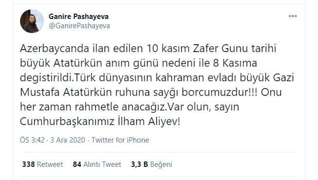 Azerbaycan Cumhurbaşkanı İlham Aliyev'in Türkiye temsilcisi Ganire Paşayeva tarafından duyurulan değişikliğe göre, Zafer Günü 8 Kasım'da kutlanacak. Paşayeva, sosyal medya sitesinden konuyla ilgili şu paylaşımı yaptı: