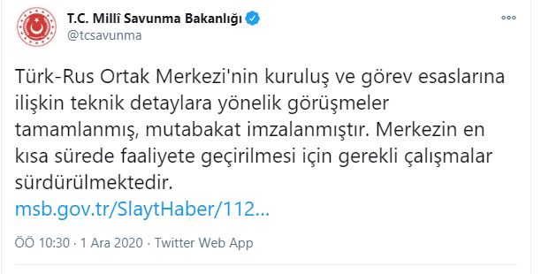 "Azerbaycan ile Ermenistan arasındaki ateşkesin uygulanmasını gözetmek ve denetlemek amacıyla, 11 Kasım'da Milli Savunma Bakanımız Hulusi Akar ile Rusya Savunma Bakanı Sergey Şoygu arasında video telekonferans yöntemiyle mutabakat zaptı imzalanmıştı. Türk-Rus Ortak Merkezi’nin kuruluş ve görev esaslarına ilişkin teknik detaylara yönelik görüşmeler tamamlanarak mutabakat imzalanmıştır. Merkezin en kısa sürede faaliyete geçirilmesi için gerekli çalışmalar sürdürülmektedir."