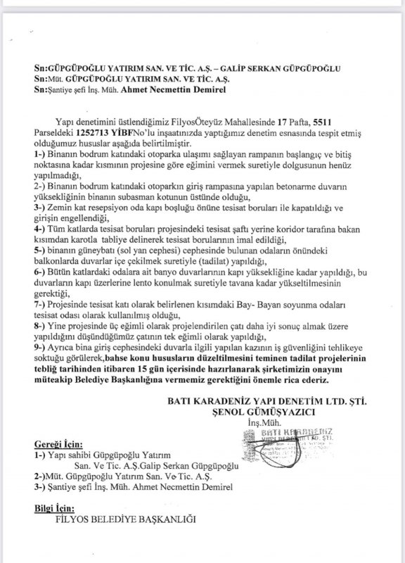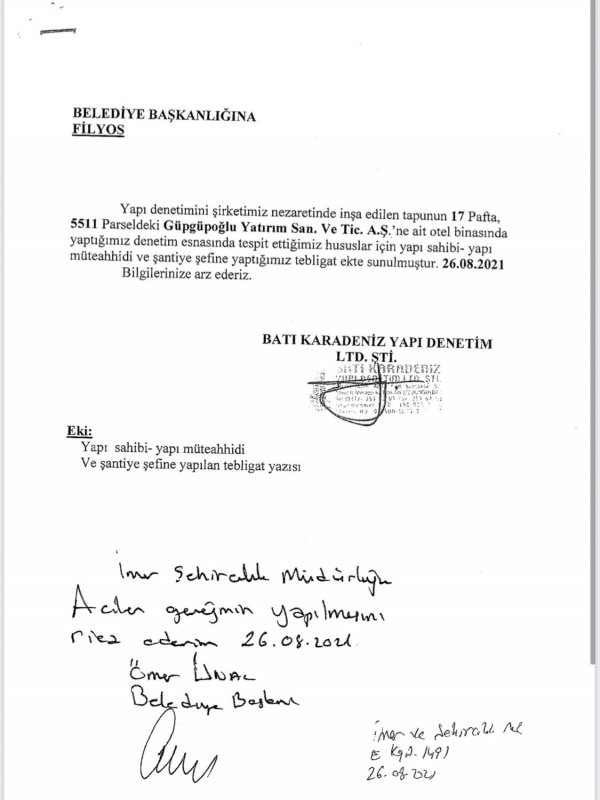 “Son günlerde Beldemizdeki otel inşaatı ile ilgili olarak bir internet sitesinde yazılan haberlere cevabımızdır. Beldemizde yapılan otel inşaatı Belediyemiz ekiplerince, 08.09.2021 günü mühürlenmiştir, mühürleme işlemi haberde bahsedildiği gibi olmayıp, inşaatı yapan Güpgüpoğlu San. A.Ş. tarafından 3194 sayılı imar kanununun ilgili maddelerine göre ruhsat ve eklerine aykırı olarak inşaat yapıldığının, ekte sunduğumuz yapı denetim şirketinin 26.08.2021 tarihli yazısına istinaden belediyemiz ekiplerince yapılan incelemede otel inşaatında yapı denetim firmasının belediyemize bildirdiğinden daha fazla ruhsat ve eklerine aykırı iş ve işler yapıldığı tespit edilmiştir.