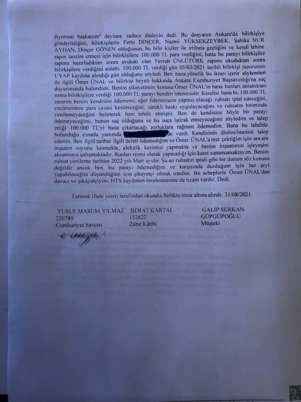 Galip S. Güpgüpoğlu Başkan Ünal’ın bilirkişilere ödediğinin iddia ettiği rüşveti üstlenmesi talebini karşılamayı kabul etmeyince, tehditlere maruz kaldığını ve otelinin mühürlenerek inşaatı bitirmesinin engellendiğini öne sürüyor.