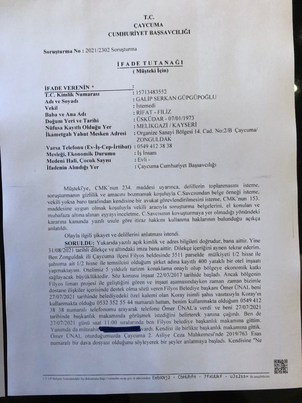 Galip S. Güpgüpoğlu Savcılıkta ifade verdi ve yaşadıklarını detayları ile anlattı. Güpgüpoğlu’nun Savcılığa verdiği ifadeye göre, Filyos Belediye Başkanı Ömer Ünal, özel kalem görevini yapan Koray adlı şahısın telefonundan kendisini aramış ve belediyeye gelmesini istemişti. Yanında bir müteahhit arkadaşı ile birlikte aynı gün, saat 11 sıralarında belediyeye giden Galip S. Güpgüpoğlu, Başkan Ömer Ünal’ın rüşvetle ilgili yargılandığı bir davada beraat edebilmek için, Fethi D., Nazmi Y., Şahika Nur A. ve Dinçer G.’den oluşan bilirkişi heyetine 100 bin TL rüşvet vermek zorunda kaldığını belirterek, bu parayı Galip S. Güpgüpoğlu’ndan istemesi ile karşılaşmıştı.